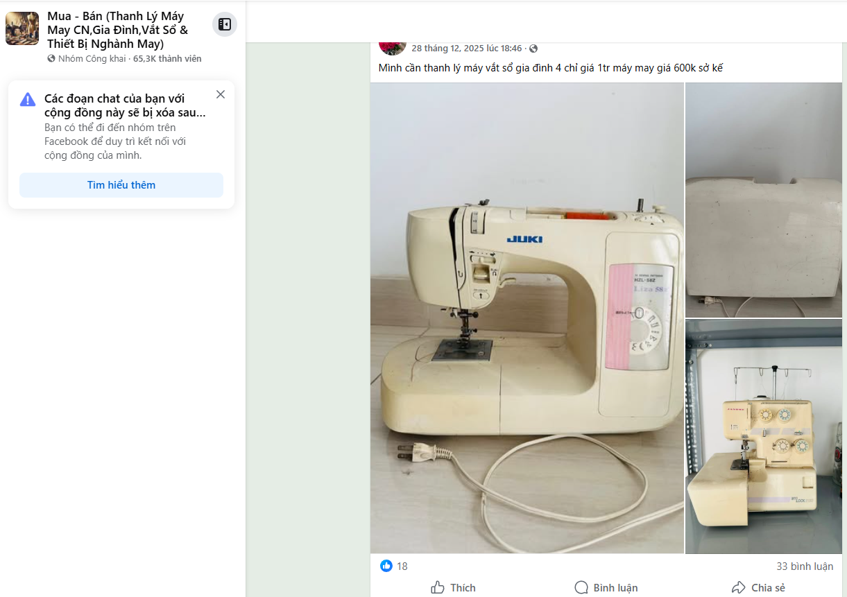 Facebook là nơi tập trung rất nhiều hội nhóm mua bán máy may, máy vắt sổ cũ. Người bán thường là thợ may không còn nhu cầu sử dụng, tiệm may đóng cửa hoặc người nâng cấp lên máy mới. Ưu điểm của hình thức này là giá khá “mềm”, dễ thương lượng và đa dạng mẫu mã.